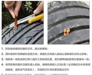 目前常用的方法就是貼片內(nèi)補(bǔ)法,先檢查輪胎的破損位置,然后仔細(xì)平整破損處,在孔洞周?chē)可夏z水,將專用的橡膠貼片貼在破損處并壓緊牢固,然后涂上一層保護(hù)膠,完成輪胎的修補(bǔ)工作,這種方法與自行車(chē)上常用的輪胎修補(bǔ)方法基本一致。這種方法的缺點(diǎn)是,損壞的部件容易被雨水等污染物腐蝕,只有輪胎內(nèi)部才能修復(fù),輪胎完成后,應(yīng)進(jìn)行動(dòng)態(tài)平衡校準(zhǔn)。但通常效果很好,價(jià)格不超過(guò)100元。