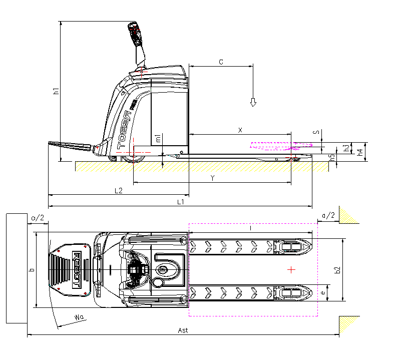 | 直角堆垛通道寬度,托盤800x1200(1200沿貨叉邊) | Ast mm | 2550 | |||
